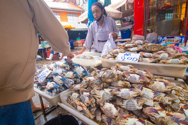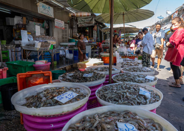 Visite de Mahachai, un port de pêche renommé pour son grand marché aux poissons et crustacés, où l’on peut déguster des spécialités locales comme le calamar et la pieuvre, proposés sous différentes formes.